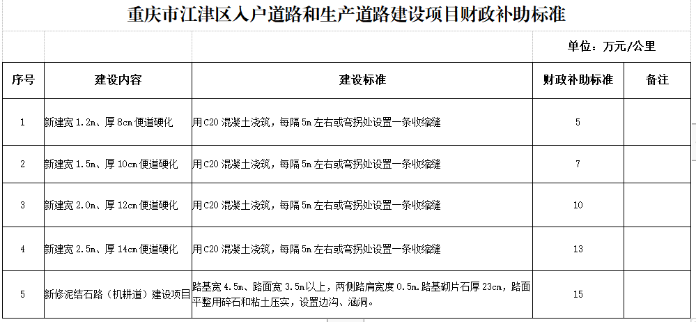 附件:《重慶市江津區(qū)入戶道路和生產(chǎn)道路建設(shè)項(xiàng)目財(cái)政補(bǔ)助標(biāo)準(zhǔn)》