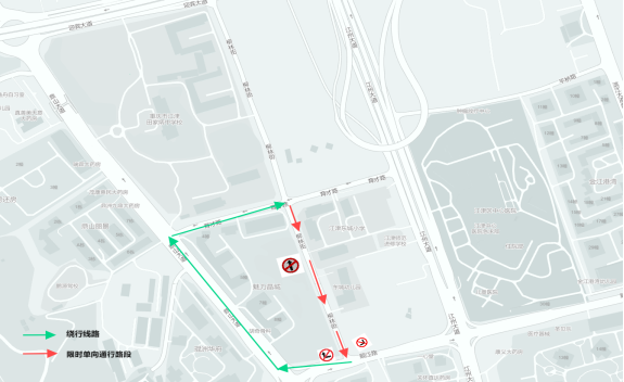 學校開學行課期間,每日上午7:30—8:30、下午16:40—17:50實施限時單向通行(學校假期除外)。