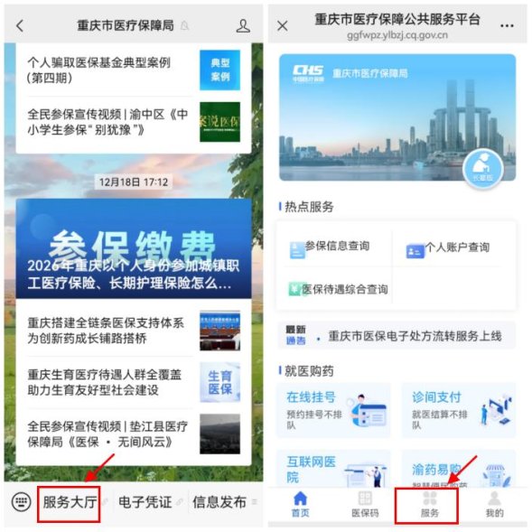 1.關(guān)注“重慶市醫(yī)療保障局“微信公眾號,注冊登錄,點擊【服務(wù)大廳】,點擊底部的【服務(wù)】;