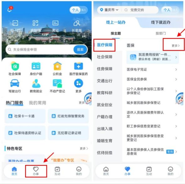 1.登錄渝快辦APP,點擊【辦事】,在【醫(yī)療保障】模塊點擊【更多】;