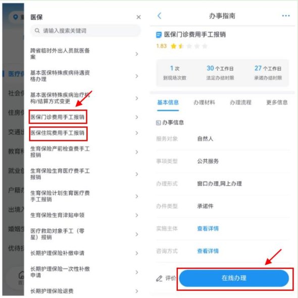 2.根據(jù)需求選擇【醫(yī)保門診費用手工報銷】或【醫(yī)保住院費用手工報銷】,點擊【在線辦理】進入頁面辦理。