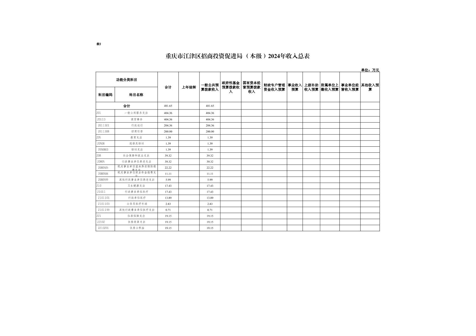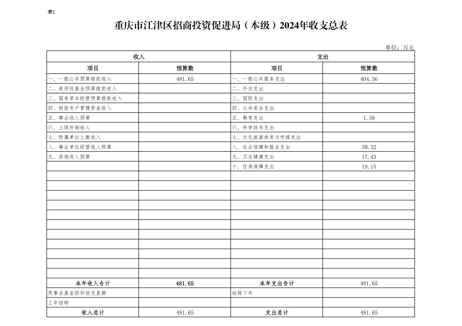2024年年初預算收入總計481.65萬元,支出總計481.65萬元。收支較上年預算數減少133.39萬元, 減少21.69%,主要是壓縮項目經費,項目經費有所減少。