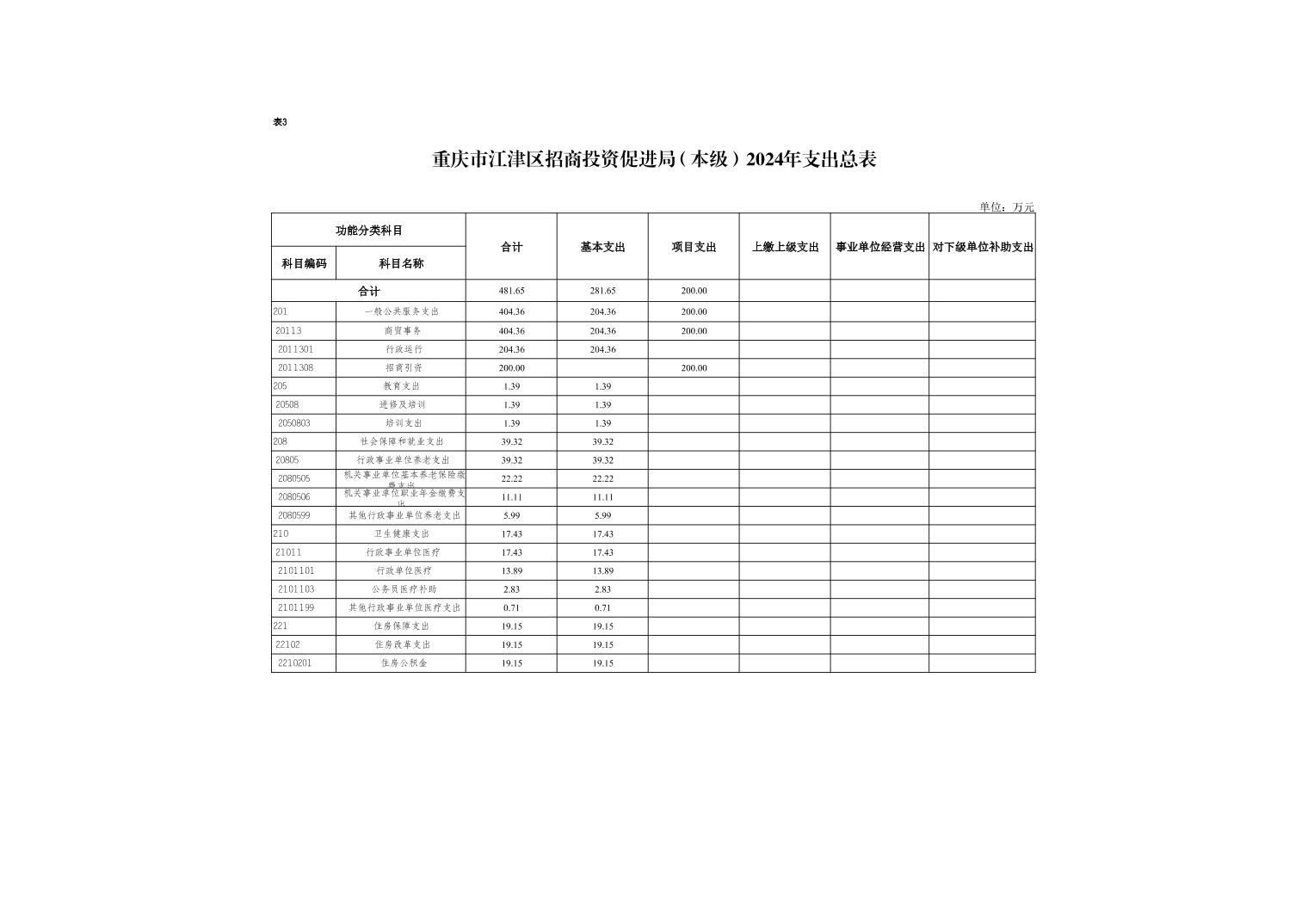 2024年一般公共預算財政撥款收入481.65萬元,一般公共預算財政撥款支出481.65萬元,比2023年減少133.39萬元。其中:基本支出281.65萬元,比2023年增加7.71萬元,主要原因是預算口徑有所變化,主要用于保障在職人員工資福利及社會保險繳費,離休人員離休費,退休人員補助等,保障部門正常運轉的各項商品服務支出;項目支出200萬元,比2023年減少141.1萬元,主要原因是壓縮項目經費,項目經費有所減少,主要用于駐外開展招商引資工作、接待客商來津洽談項目、招商環境推介宣傳、重大招商引資活動等重點招商工作。
