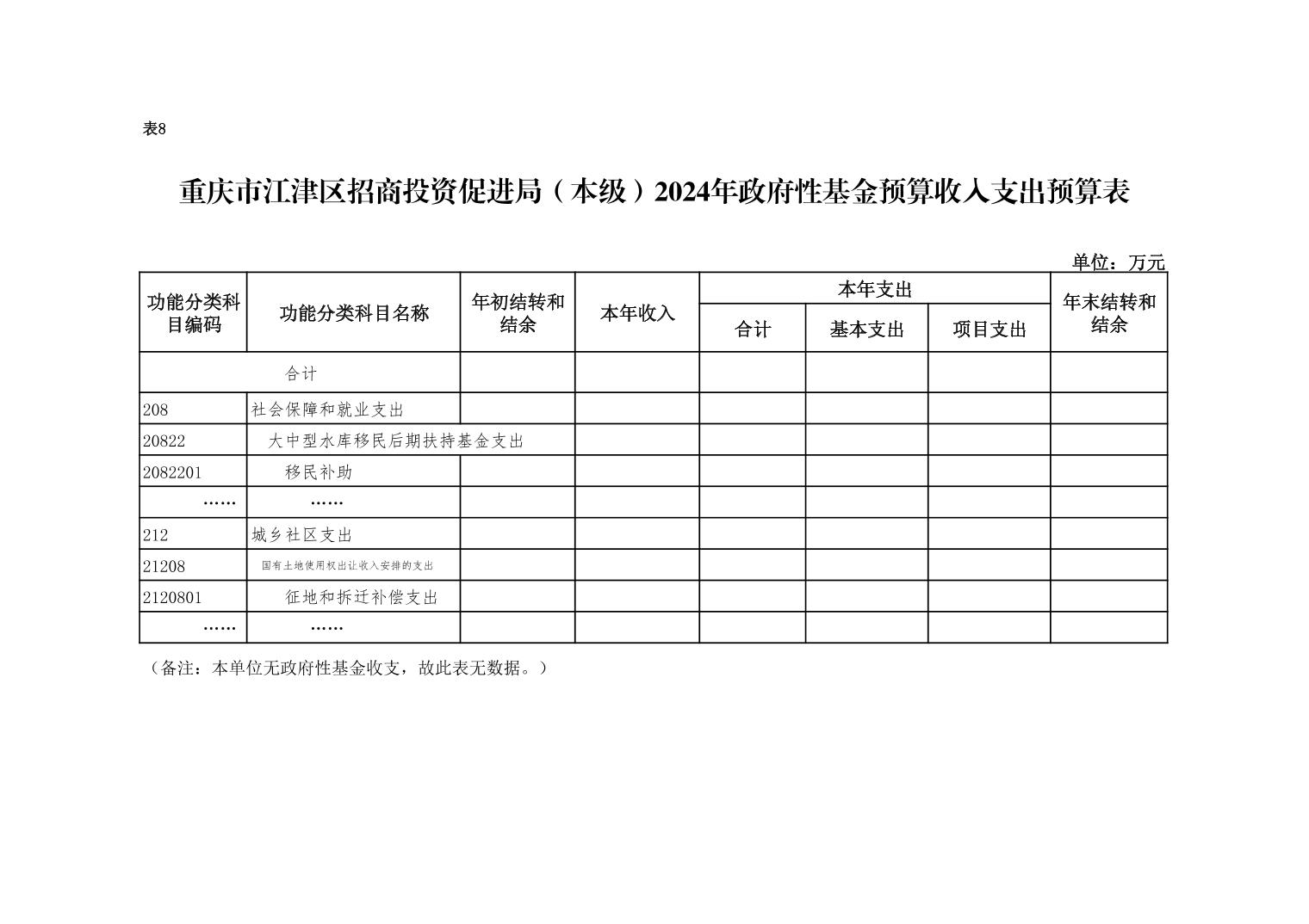 重慶市江津區招商投資促進局(本級)2024年無使用政府性基金預算撥款安排的支出。
