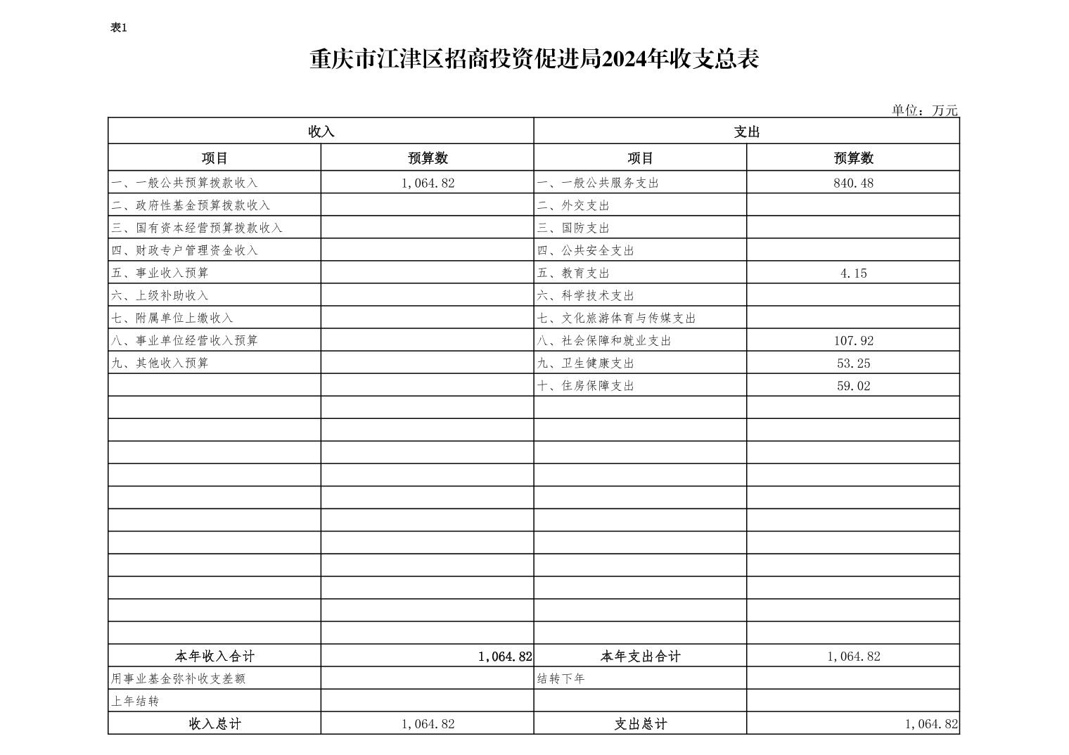 2024年年初預算收入總計1064.82萬元,支出總計1064.82萬元。收支較上年預算數減少65.72萬元,減少5.81%,主要原因是壓縮項目經費,項目經費有所減少。