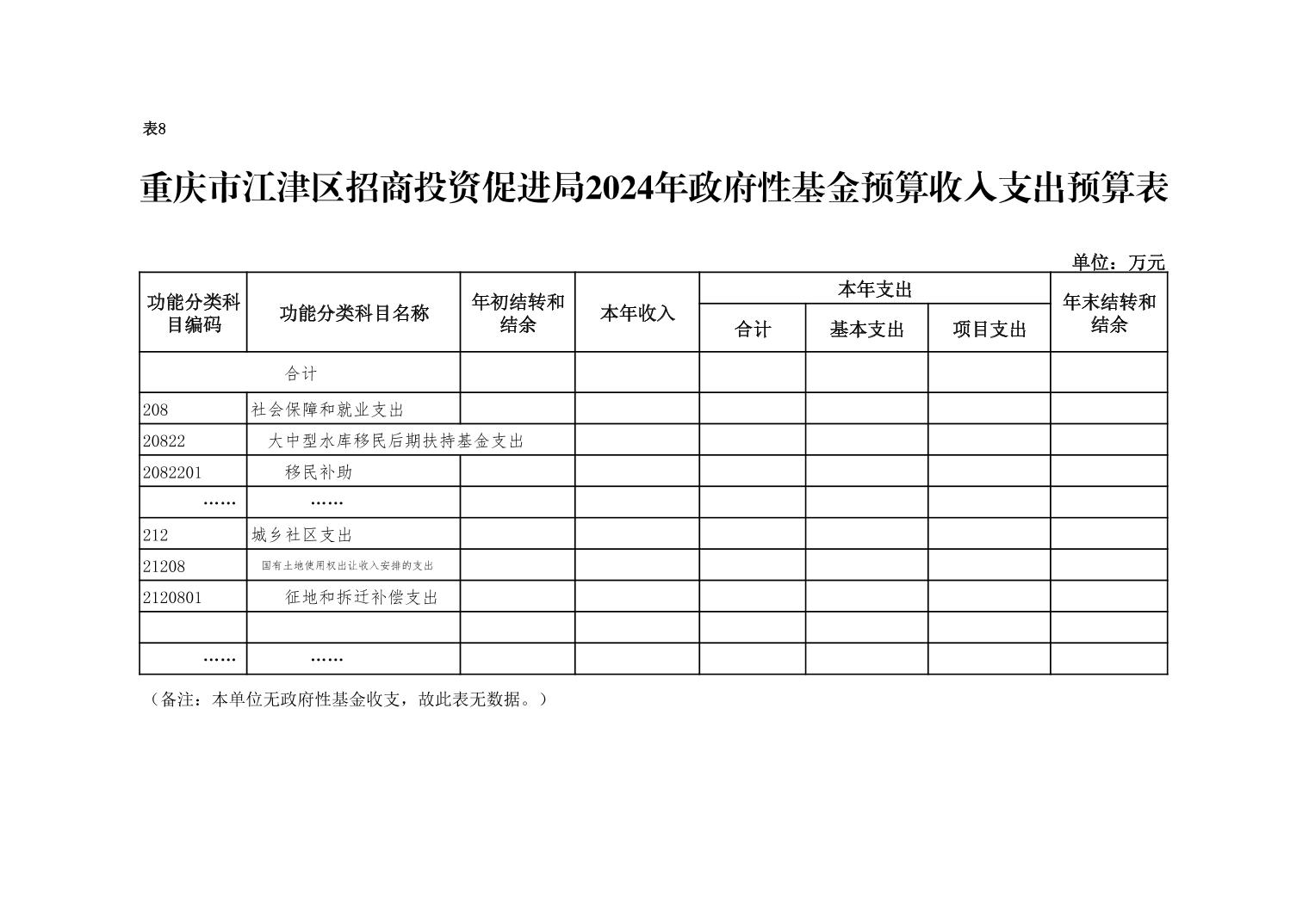 重慶市江津區招商投資促進局部門2024年無使用政府性基金預算撥款安排的支出。