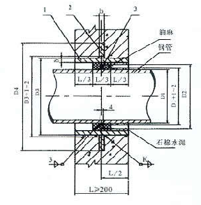 5、Ⅱ型套管穿墻處之墻壁,如遇非混凝土墻壁時應改用混凝土墻壁,其澆注混凝土范圍,Ⅱ型套管應比翼環(huán)直徑(D4)大200mm,而且必須將套管一次澆固于墻內。套管內的填料應緊密搗實。