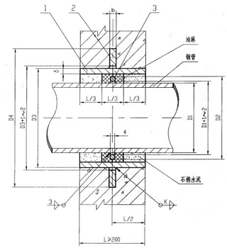 S312型剛性防水套管性能:1.S312型剛性防水套管穿墻處如遇非混凝土墻壁時(shí),應(yīng)改用混凝土墻壁,其澆注范圍應(yīng)比翼環(huán)直徑(D4)大200,而且必須將套管一次澆固于墻內(nèi),套管內(nèi)的填料應(yīng)緊密搗實(shí)。2.S312型剛性防水套管穿管…