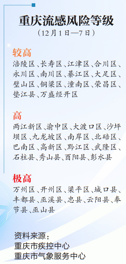 數據顯示,12月1日—7日,兩江新區、渝中區、大渡口區、沙坪壩區、九龍坡區、南岸區、北碚區、巴南區、高新區、黔江區、武隆區、石柱縣、秀山縣、酉陽縣、彭水縣流感風險等級高,涪陵區、長壽區、江津區、合川區、永川區、南川區、綦江區、大足區、璧山區、銅梁區、潼南區、榮昌區、墊江縣、萬盛經開區流感風險等級較高,萬州區、開州區、梁平區、城口縣、豐都縣、巫溪縣、忠縣、云陽縣、奉節縣、巫山縣流感風險等級極高。