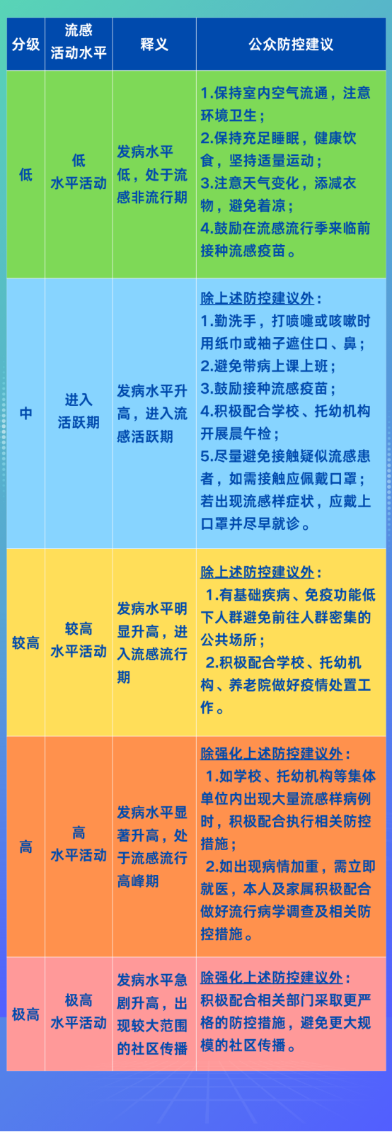 高風險等級意味著流感發病水平顯著升高,進入流感流行高峰期。專家建議,除強化上述防控建議外,如學校、托幼機構等集體單位內出現大量流感樣病例時,應積極配合執行相關防控措施;如出現病情加重,需立即就醫,本人及家屬積極配合做好流行病學調查及相關防控措施。