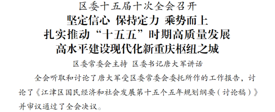 全會討論了《江津區國民經濟和社會發展第十五個五年規劃綱要(討論稿)》,審議通過了《中國共產黨重慶市江津區第十五屆委員會第十次全體會議決議》。