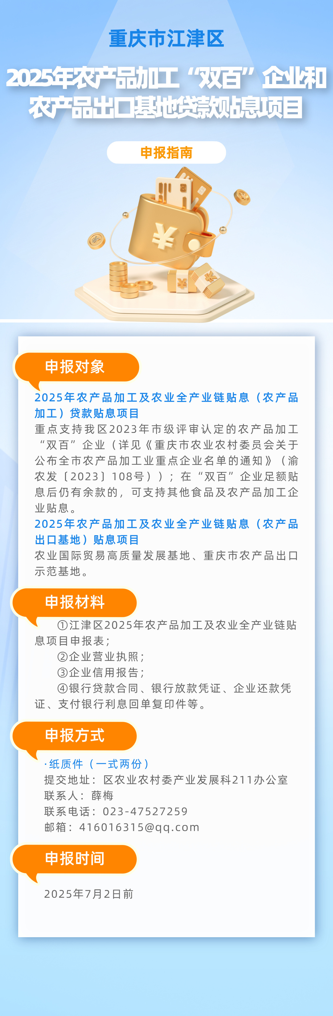 申報(bào)指南:重慶市江津區(qū)2025農(nóng)產(chǎn)品加工“雙百”企業(yè)和農(nóng)產(chǎn)品出口基地貸款貼息項(xiàng)目